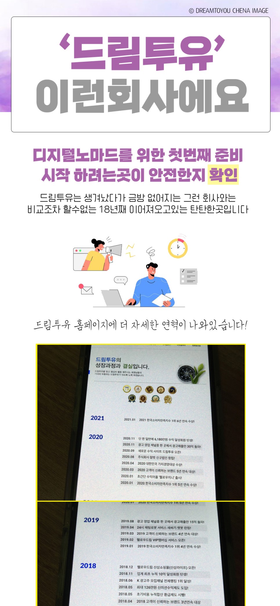 드림투유의 장점을 활용한다는 장점은 수없이 많지만 단점도 있습니다 먼저 간단히 설명하자면 저는 부가적인 추가금이 들지 않아 너무 좋았습니다예를 들어 교통비, 식대 같은 것은 일절 들지 않고 무엇보다 제가 하고 싶은 시간에 일을 할 수 있다는 것이 장점이 있어 좋은 장점 중 하나입니다. 지금 당장 아는 사람을 봐도 출퇴근 시간이 딱 정해져 있지만 드림투유는 그런 일 없이 제가 하고 싶은 시간에 언제든지 컴퓨터 앞에 앉아서 업무를 시작하면 되고 또 제가 하는 만큼 연봉억 단위까지도 가능한 일이기 때문에 정말 노력하면서 일하다 보면 수익은 꼭 따라온다는 보장이 있습니다.