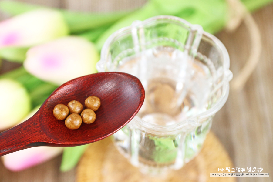 나무 숟가락은 저희 집에 있는 소품인데 동그라미 5알이 넉넉히 들어갈 정도로 작은 크기라 물과 함께