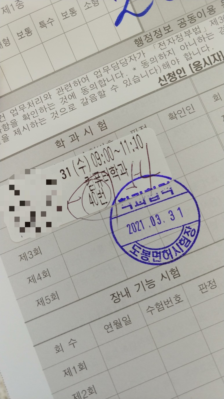 시험장은 지난해 동생이 먼저 면허를 따고 동생이 하던 경로를 따랐다.도봉 운전면허시험장에서 필기를 보고 마지막으로 면허증을 발급받아 학과교육, 기능, 도로주행은 모두 창동운전학원에서 했다.