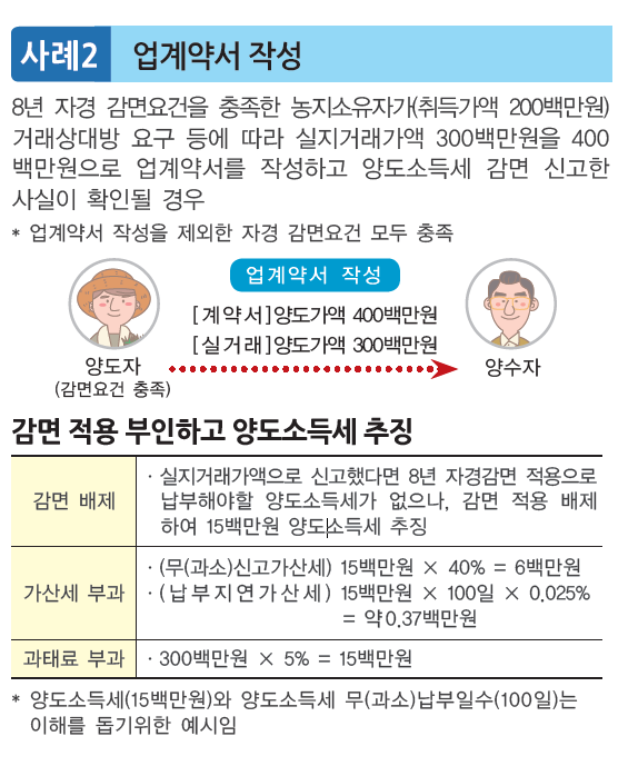 비과세·감면 규정 적용은 배제되어 양도소득세를 추징합니다.양도자 1가구 1주택 비과세 8년 자경농지에 대한 감면 요건을 충족하고도 비과세 감면 배제 후 양도소득세를 추징 양수한 부동산을 향후 양도도시에도 비과세 감면규정 적용배제를 동일하게 적용하여 양도소득세 추징 가산세가 붙습니다.■ 무(과소)신고 가산세 : 무(과소)신고 납부세액의 최고 40%에 해당하는 가산세가 부과됩니다.■ 납부지연가산세 : 납부하지 않은 세액 또는 과소납부세액의 의무(과소) 납부일수당 0.0025%에 해당하는 가산세가 부과됩니다.※여기서 무(과소)납부일수란 납부기한의 익일~납부일까지의 기간을 말합니다.