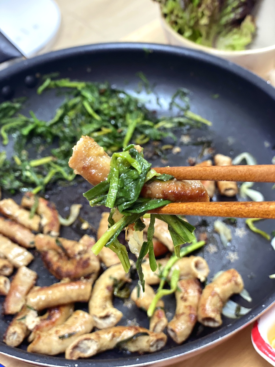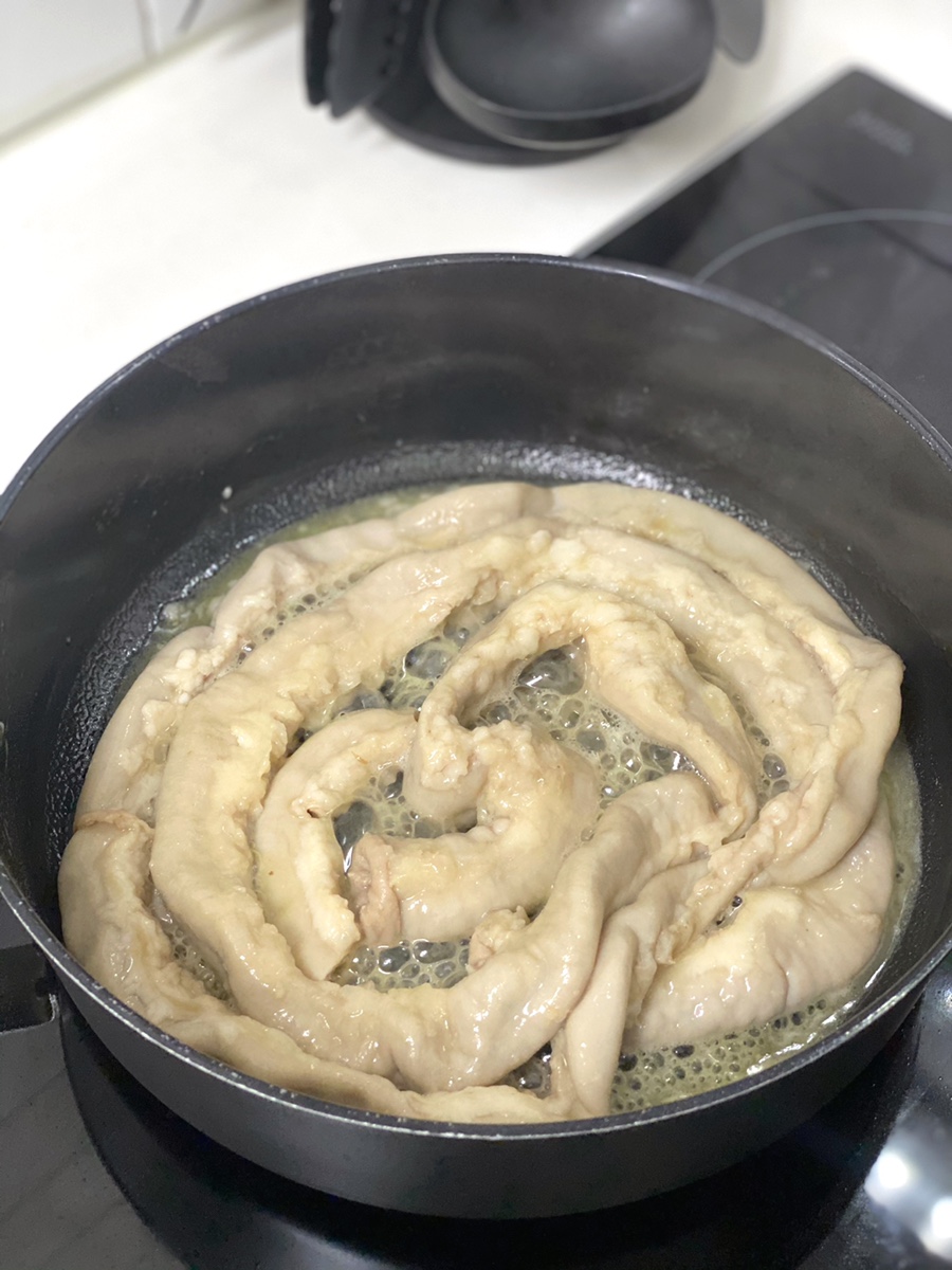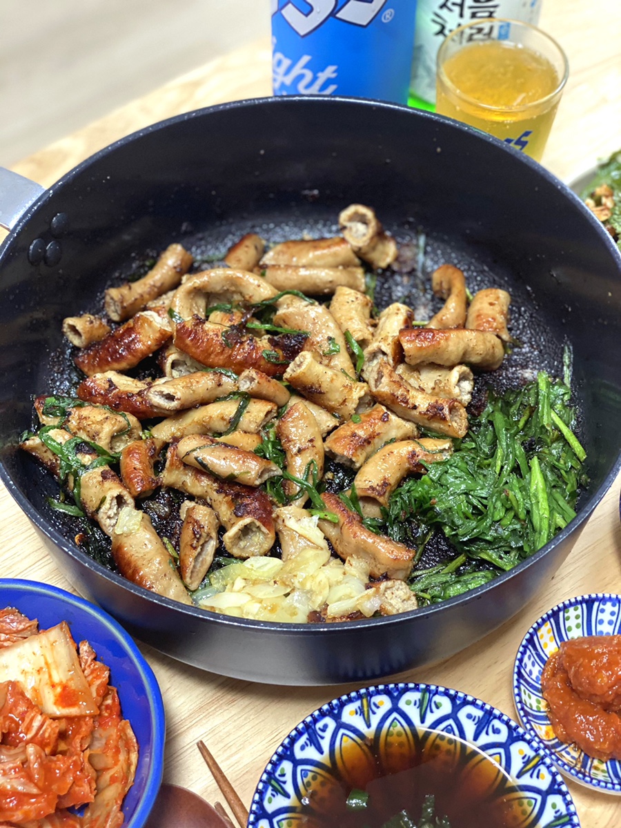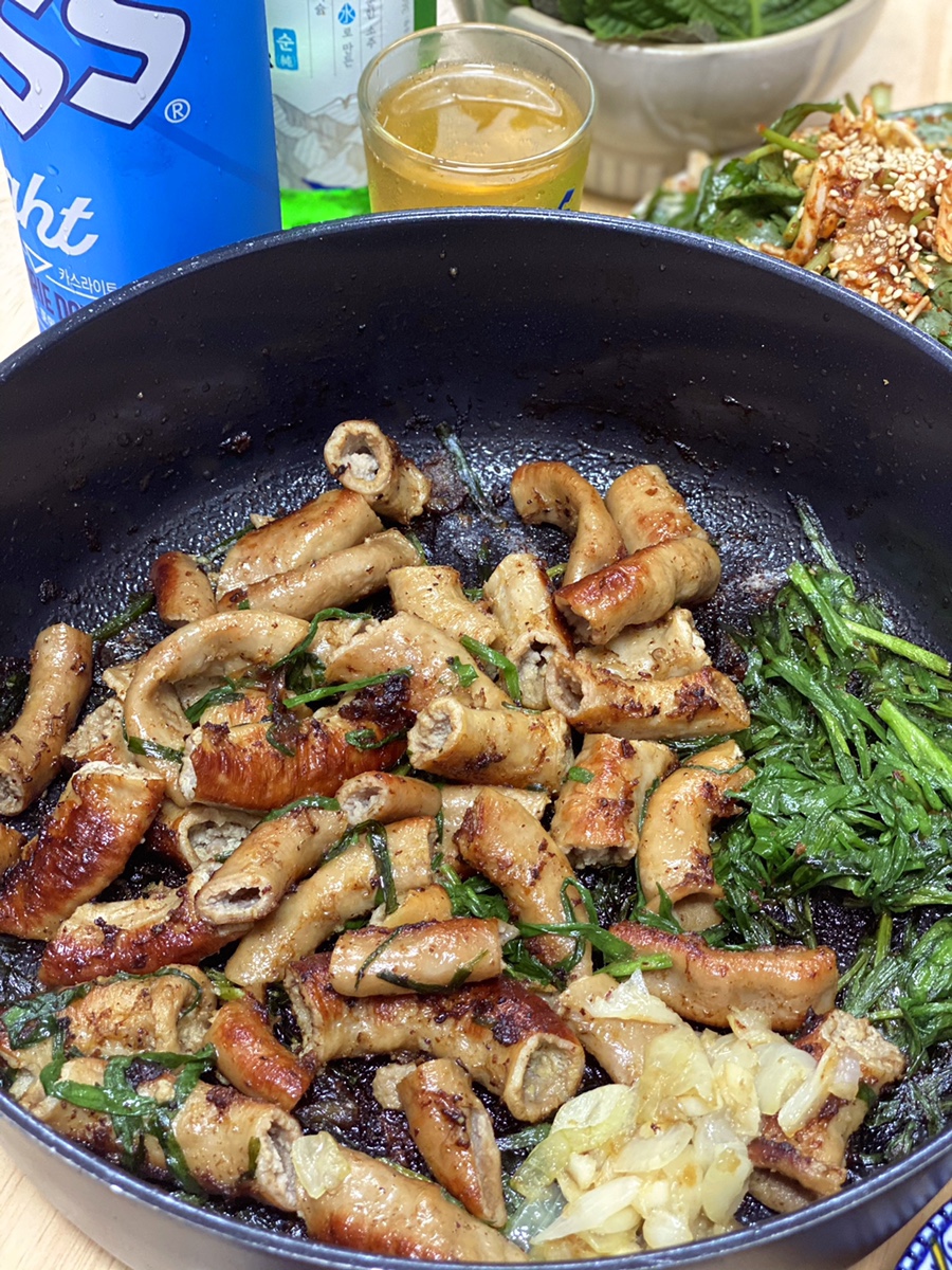 평일 스트레스 풀고 싶은 날 얼려서 보관하고 있던 소 팔십 소곱창을 꺼내서 조기퇴근했더니 물렁물렁 해동이 잘 되더라고요~ 상온이나 냉수 또는 냉장해동하라고 되어있어 뜨거운 물에 냉동하면 냄새가 날 수 있어요!!!! 어머! 대단하네요. 여러가지 부웅!!두 봉지도 꺼내놨는데 다 먹을수 있을까 하는 생각은 아주 쓸데없는 고민이었음을 ㅋㅋㅋㅋㅋㅋ 불도 심하게 올려서 소곱창집에서 해주듯 뱅글뱅글 나무결 따라 소곱창을 팬들에게 둘러서 주꼬양 파닌닉 때려넣고 보글보글~~~~ 제대로 먹고 싶어서 기름을 닦지 않고 거의 소의 곱창 기름에 소의 곱창을 튀겼다고 보시면 됩니다. 익을 때 부추 한 줌 넣고 지글지글 소리부터 미쳤어 정말 쫄깃쫄깃해서 큼직큼직하게 곱창을 썰어서 마지막에 볶아주고요 '꺄악', '꺄악', '꺄악', '꺄악', '꺄악', '꺄악', '꺄악', '꺄악' 남편 고생했으니까 맥주 한 잔 해요! 집에서 소곱창을 굽다니 크하하항복한다중말.< 잘 구워진 소곱창구이 한장 부추 한장 집어서 쩝쩝~~~~~~~~~~~~~~~~~~ 겉은 바삭바삭하고 속은 촉촉해서 쭈글쭈글해서 힘들어.