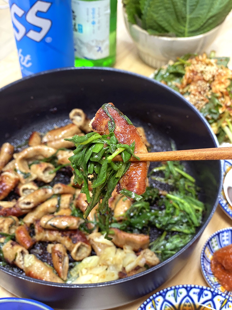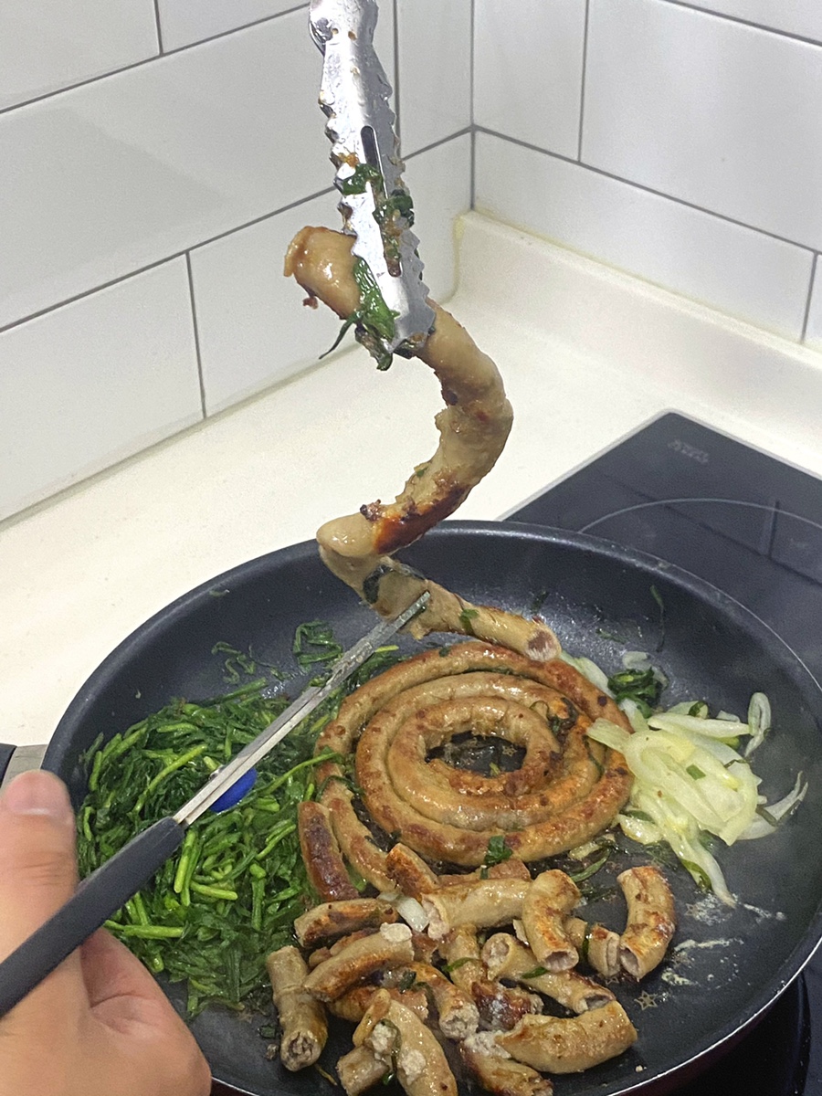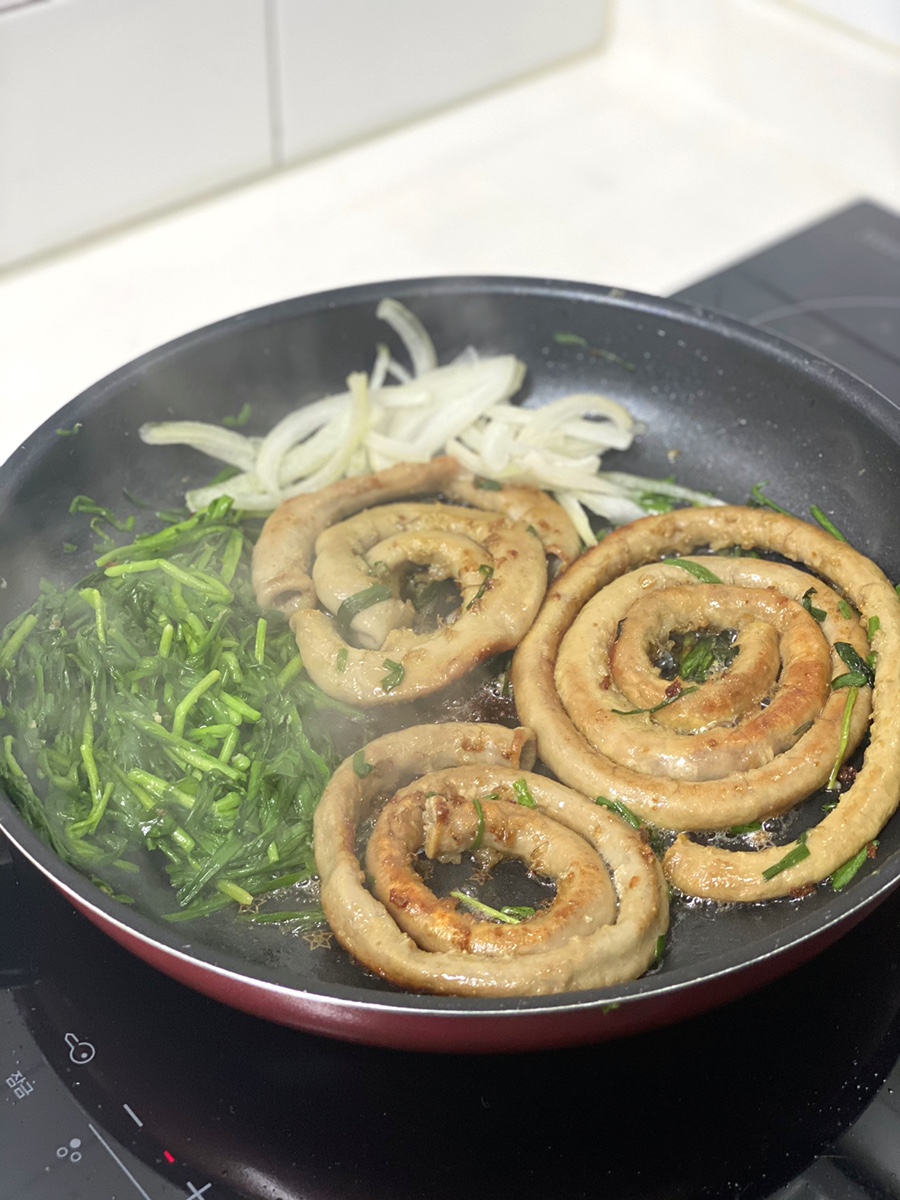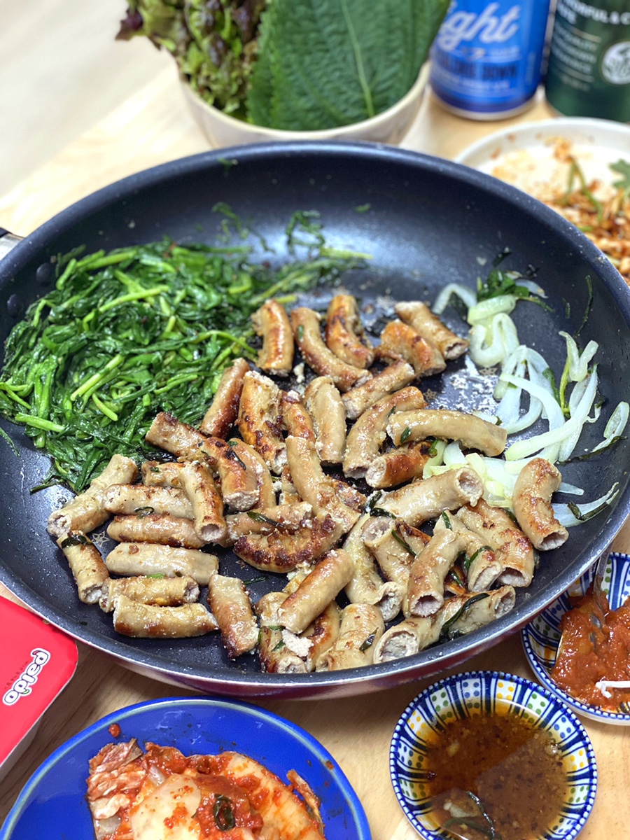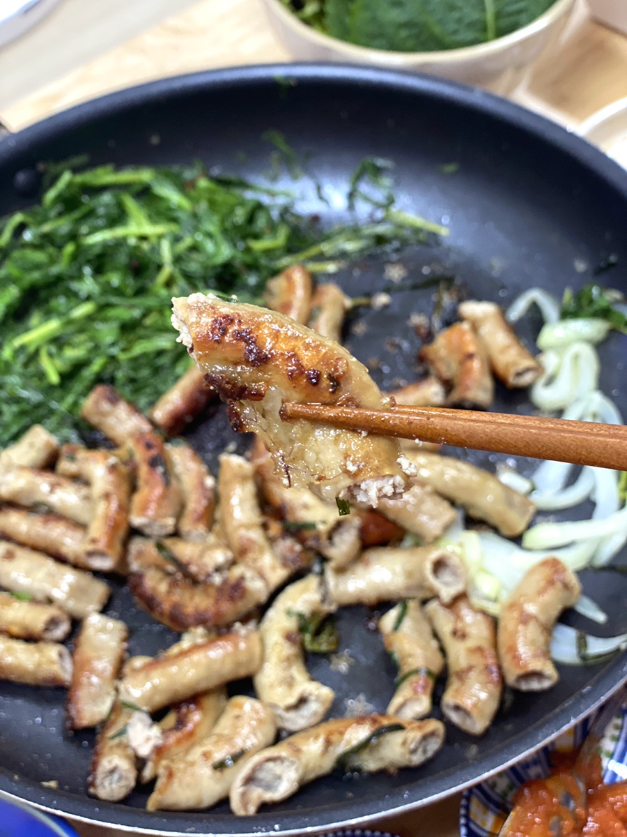 평일 스트레스 풀고 싶은 날 얼려서 보관하고 있던 소 팔십 소곱창을 꺼내서 조기퇴근했더니 물렁물렁 해동이 잘 되더라고요~ 상온이나 냉수 또는 냉장해동하라고 되어있어 뜨거운 물에 냉동하면 냄새가 날 수 있어요!!!! 어머! 대단하네요. 여러가지 부웅!!두 봉지도 꺼내놨는데 다 먹을수 있을까 하는 생각은 아주 쓸데없는 고민이었음을 ㅋㅋㅋㅋㅋㅋ 불도 심하게 올려서 소곱창집에서 해주듯 뱅글뱅글 나무결 따라 소곱창을 팬들에게 둘러서 주꼬양 파닌닉 때려넣고 보글보글~~~~ 제대로 먹고 싶어서 기름을 닦지 않고 거의 소의 곱창 기름에 소의 곱창을 튀겼다고 보시면 됩니다. 익을 때 부추 한 줌 넣고 지글지글 소리부터 미쳤어 정말 쫄깃쫄깃해서 큼직큼직하게 곱창을 썰어서 마지막에 볶아주고요 '꺄악', '꺄악', '꺄악', '꺄악', '꺄악', '꺄악', '꺄악', '꺄악' 남편 고생했으니까 맥주 한 잔 해요! 집에서 소곱창을 굽다니 크하하항복한다중말.< 잘 구워진 소곱창구이 한장 부추 한장 집어서 쩝쩝~~~~~~~~~~~~~~~~~~ 겉은 바삭바삭하고 속은 촉촉해서 쭈글쭈글해서 힘들어.