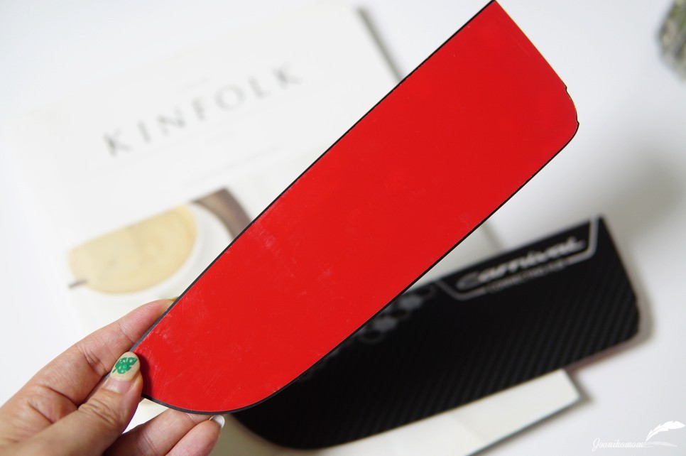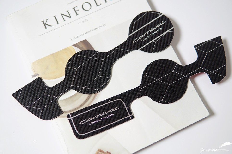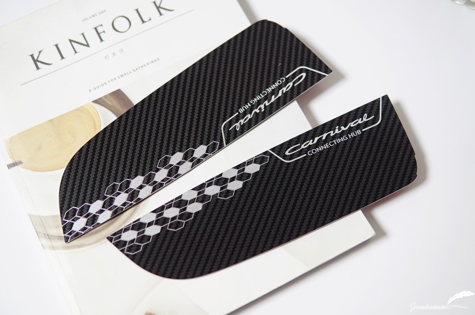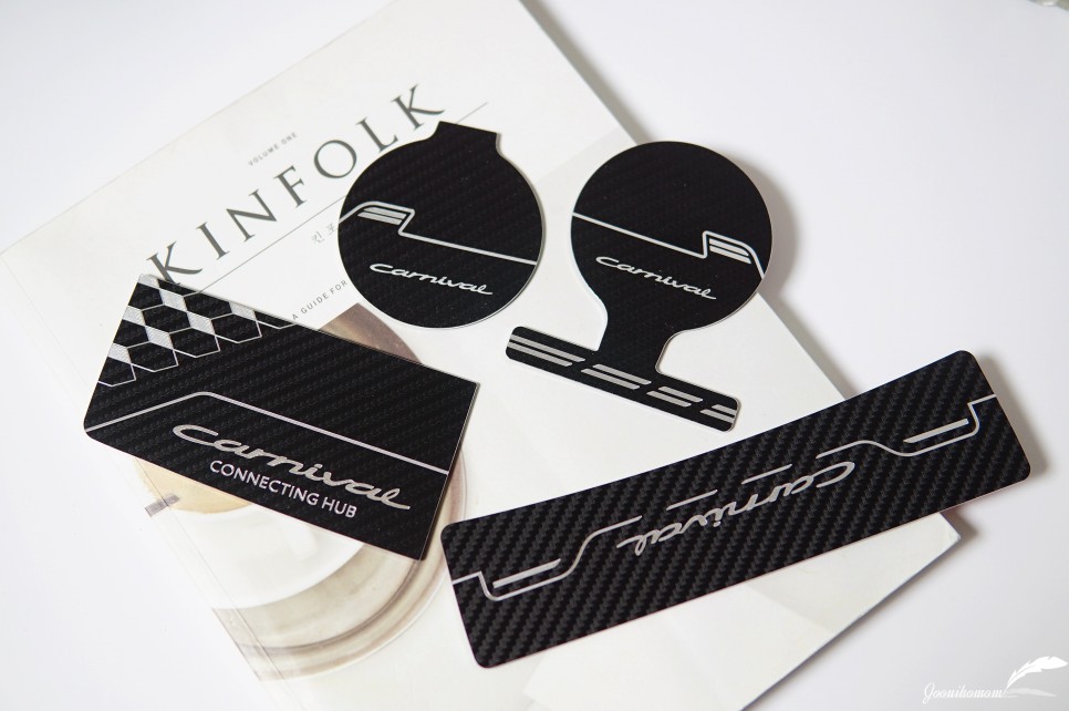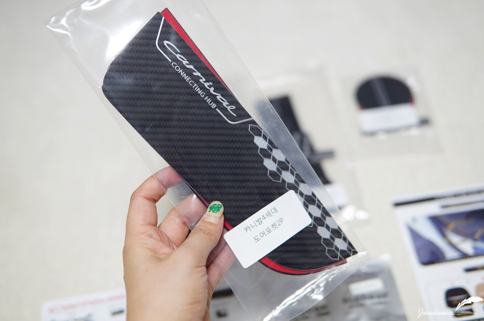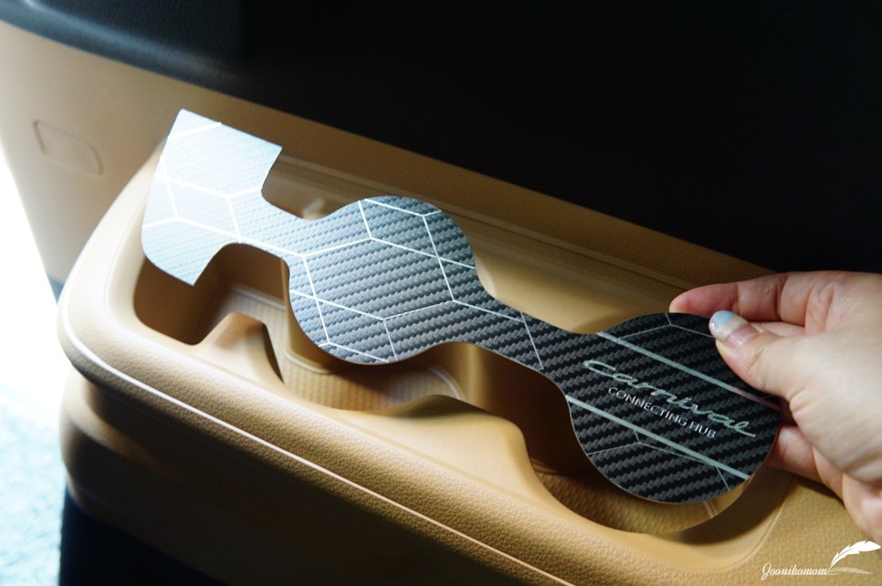 제품 뒷면에는 양면테이프로 제작되어 장착후 움직이지 않도록 고정시켜 깔끔하게 유지할 수 있습니다. 운전석과 보조석, 총 2pcs 구성으로 뒷면의 양면테이프를 제거하여 도어포켓부분에 장착하십시오 카본메탈 특유의 광택감이 돋보이는 4세대 카니발 튜닝 용품 밋밋한 실내 분위기를 고급스러운 분위기로 깔끔한 인테리어를 도와주기 때문에 기존보다 훨씬 깨끗해졌습니다.