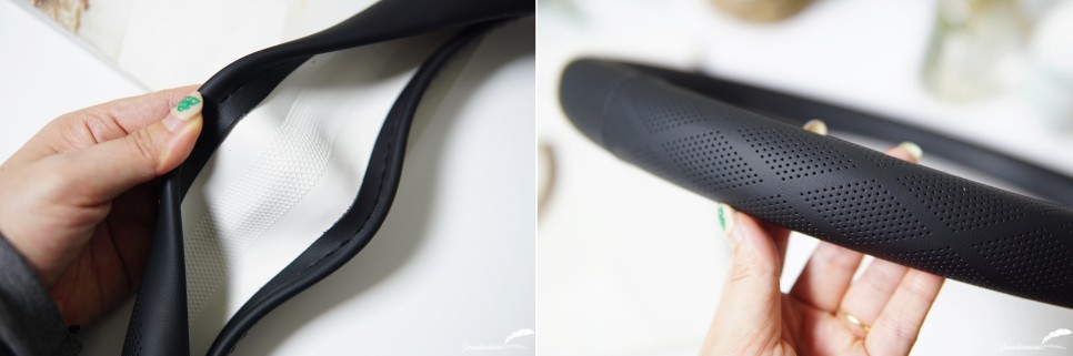손잡이 커버 윗부분을 끼운 후 오른쪽과 왼쪽 부분을 양손으로 잡으신 후 손잡이 양쪽으로 밀어넣고 아랫부분을 힘주어 아랫부분에 끼우면 힘없이 장착이 가능합니다. 확실히 프리미엄 타공 핸 돌커버라 고급스러우면서 군더더기 없는 마감처리로 깔끔하게 사용하실 수 있을 것 같아요 차량시트소재로 많이 쓰이는 인조가죽 펀칭원단이라 정품느낌이 들었어요