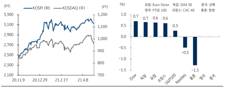 [오늘의 관전 포인트] - 미국과 유럽의 제조업 지표가 양호한 결과를 내고 경기순환주 상승, 연준도 완화적 기조 재확인 - 인디아 코로나19 등 불확실성은 여전하지만 미국 뉴욕, 유럽에서의 경제정상화 속도가 빨라지고 있는 점, 긍정적 - 공매도 재개에 따른 부진한 수급상황이 지속될 수 있으나 경기 기대감으로 투자자들의 회복세가 이어지고 있는 종목별 예상되고 있다.