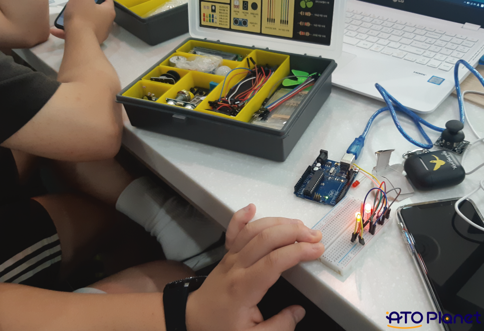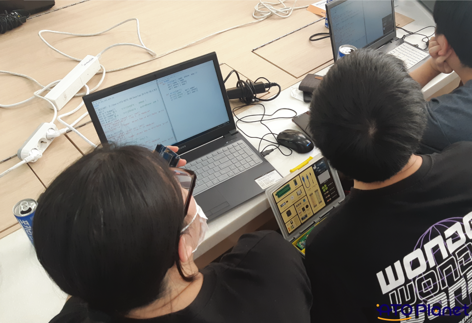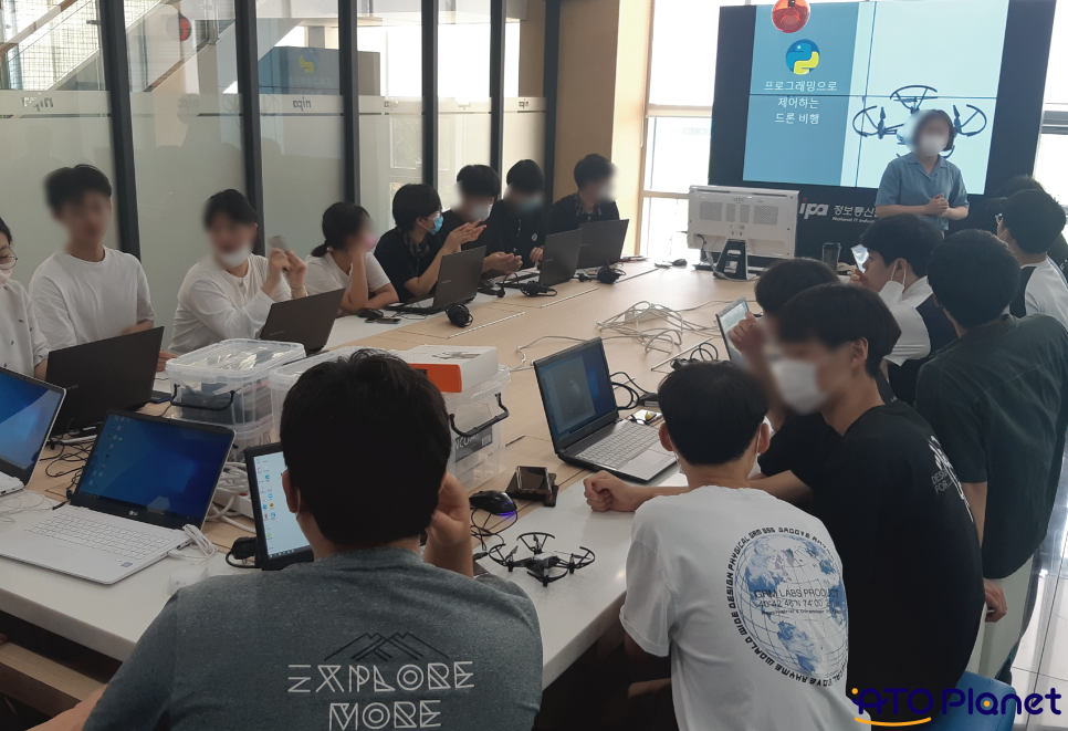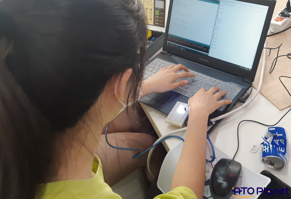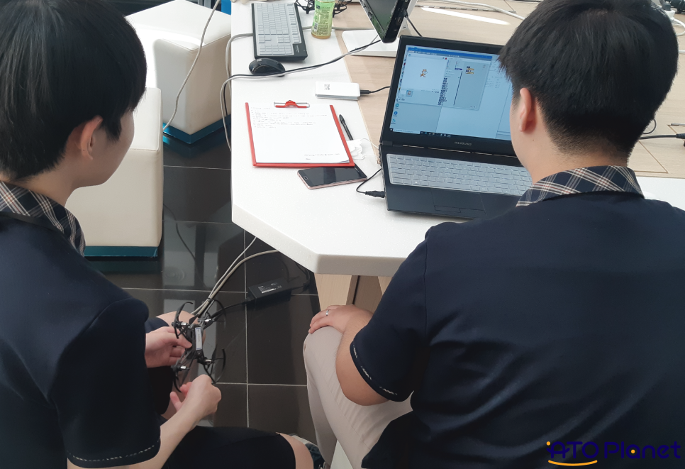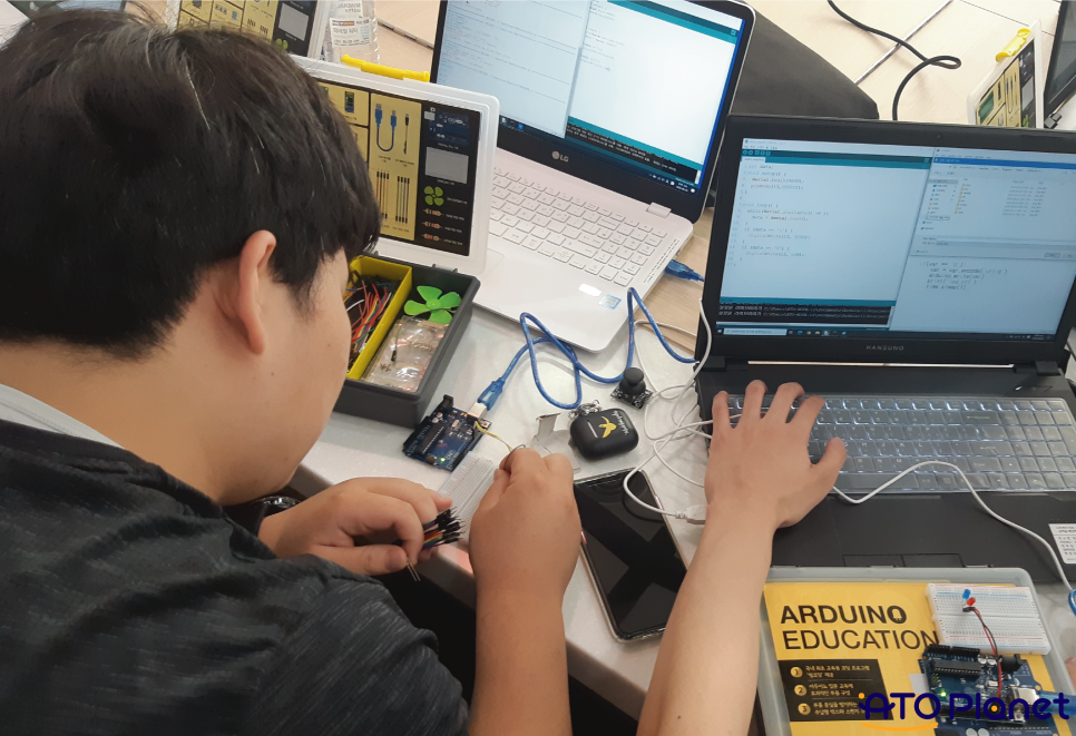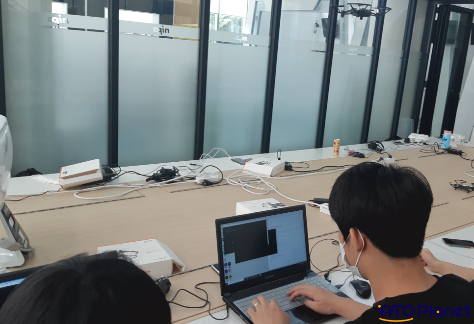 여기서 멈출 수는 없잖아요? 파이톤과 아두이노를 연결하는 방법이 있다는 사실!파이톤으로 쉽게 프로그래밍하고 아두이노보드로 재미있게 센서와 액추에이터를 연결하여 GPIO 핀을 제어하였습니다.파이톤 언어가 최초로 접하는 언어라고 느껴질지도 모릅니다만, 아토플라넷 강사의 자세한 해설로 파이톤 프로그래밍은 「빨리!」라고 이해할 수 있기 때문에, 모두 즐겁게 실습할 수 있었습니다.CHAPTER 3 프로그래밍 드론 마지막 세 번째가 되었습니다보통 프로그래밍 기기를 제작하는 교육과정에서는 완성된 코드를 올리고 테스트하는 형식으로 끝나는 경우가 많습니다. 학생들에게 전체적인 네트워크 통신을 알리고 프로그램에 들어가는 코드와 연계하여 전반적인 프로그램 내용을 알려주는 것이 'Key Point!' 비행 프로그램의 원리를 이해한 후에 학생들이 직접 비행 프로그램을 제작하고 테스트까지 해봤대요. 비록세번째라는시간이충분했던시간은아니었지만학생들의열띤호응과적극적인참여로즐겁고알찬교육을할수있었던시간이었습니다.기술을 체험하고, 해 봤다는 것도 중요하지만, 가장 중요한 것은 이해!라고 생각합니다.기술의 이해를 바탕으로 학생부터 어른까지 즐거운 메이커 문화를 만들어 갈 수 있도록 오늘도 아토플라넷은 더 나은 교육 콘텐츠를 연구합니다.그럼 다음 사기에서도 또 만나요