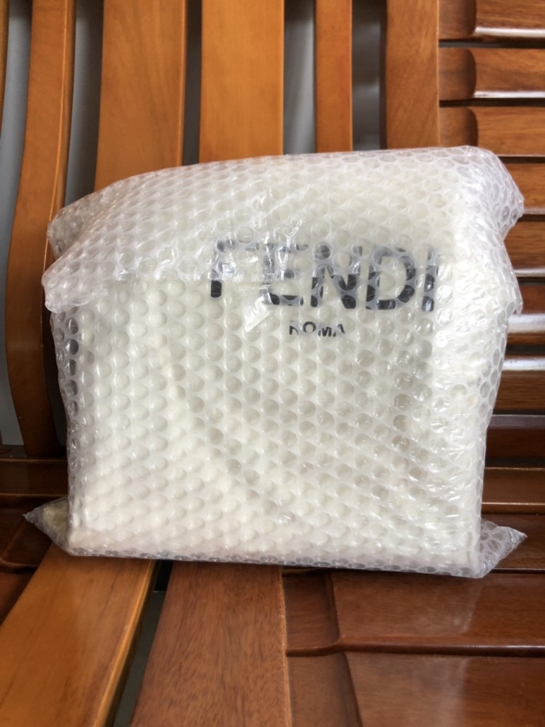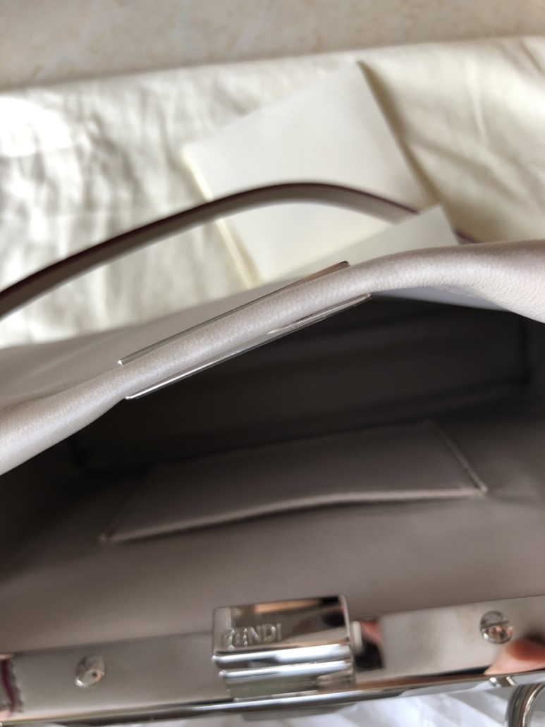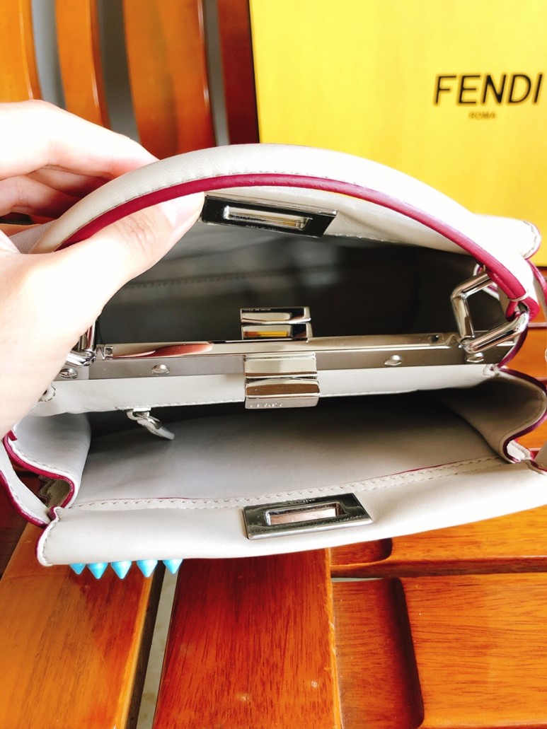 펜디 노란색 박스를 배경으로 한 컷 예쁘네~ 이 사진이 실물색에 가장 가까운 가방 안쪽도 다 가죽 전면 내부에는 지퍼가 아 이며, FENDI 각인이 새겨져 있다. 뒤쪽 내부에는 지퍼꽃 크, 작은 주머니가 있어. 미니 사이즈라 바닥에 공이 없어 측면. 이면 화려한 앞면과는 달리 뒷면은 무구하게 장식하였다.