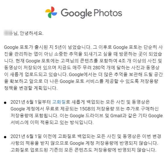 2020년 11월 12일 아침으로 구글 포토 서비스 정책이 변경된다는 메일을 받았다.2021년 6월 1일부터는 구글 계정 용량에 반영되면... 즉, 무제한 용량 백업이 없어진다는 것이다.언젠가 무제한의 백업 서비스가 없어질 것이라고 예상은 하고 있었기 때문에... 다행히, 6월 1일 이전 백업은 적용되지 않는다고 한다. 지난번 유튜브 프리미엄 가격인상을 시작으로 지금은 충분히 팬이 생겼을테니까... 수익극대화하는 방향으로 가는 것 같은.. 뭐, 기업의 목적은 수익창출이고, 그에 따라 재투자에 의한 신규제품이나 서비스로 선순환 되기를..)
