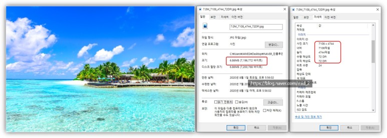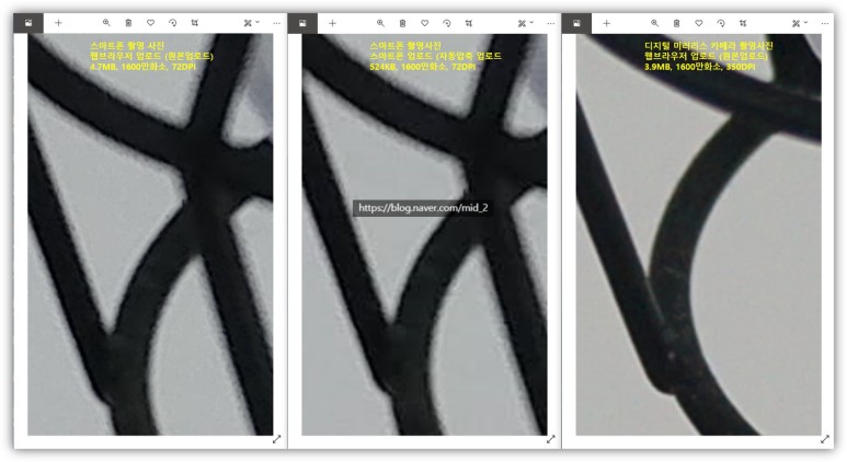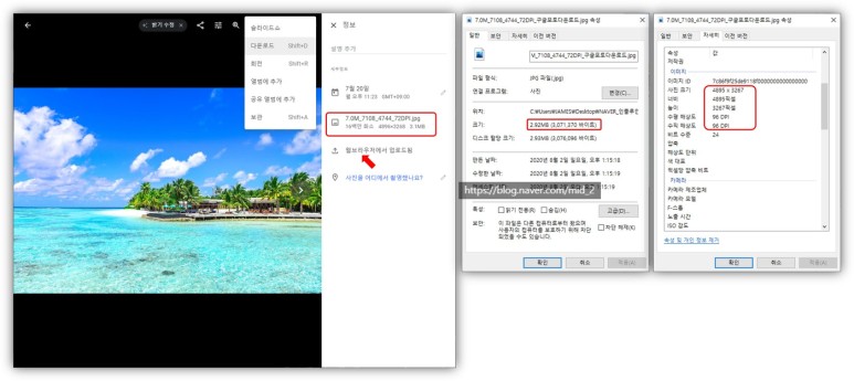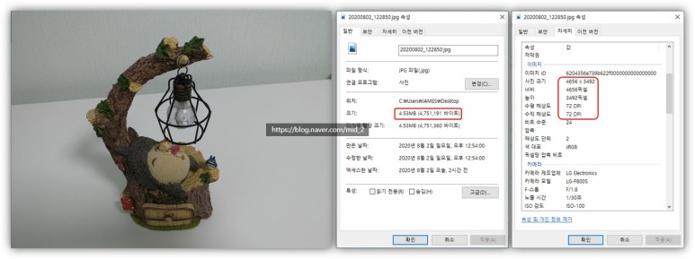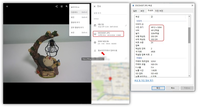 구글 포토로 다운로드 받은 사진 정보를 보면 원본이 그대로 유지돼 있다.이 경우에도 마찬가지로 PC 웹 브라우저에 업로드한 파일을 다시 다운로드해서 확인해 보면 1600만 화소, 350DPI 원본 해상도가 그대로인 것을 확인할 수 있다(뭐, 스마트폰에 백업을 이렇게 하는 이유는 대략 추측할 수 있다. ^^; ) 다음은 위의 3가지 경우로 업로드한 사진을 다시 다운로드하여 비교한 것이다.