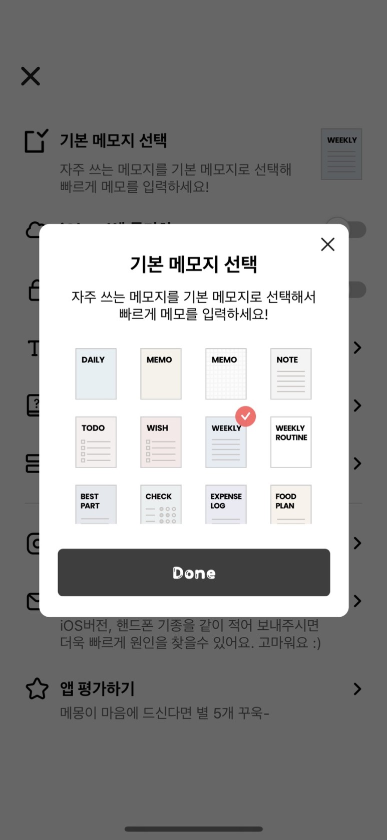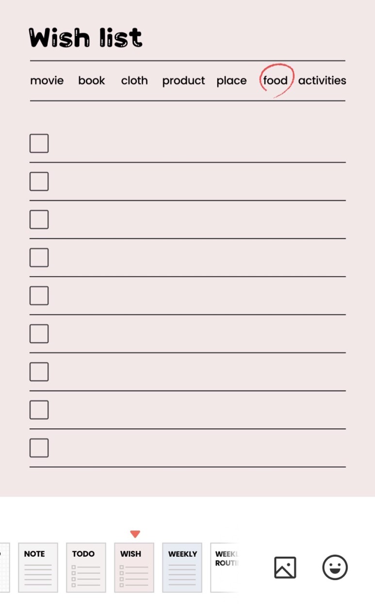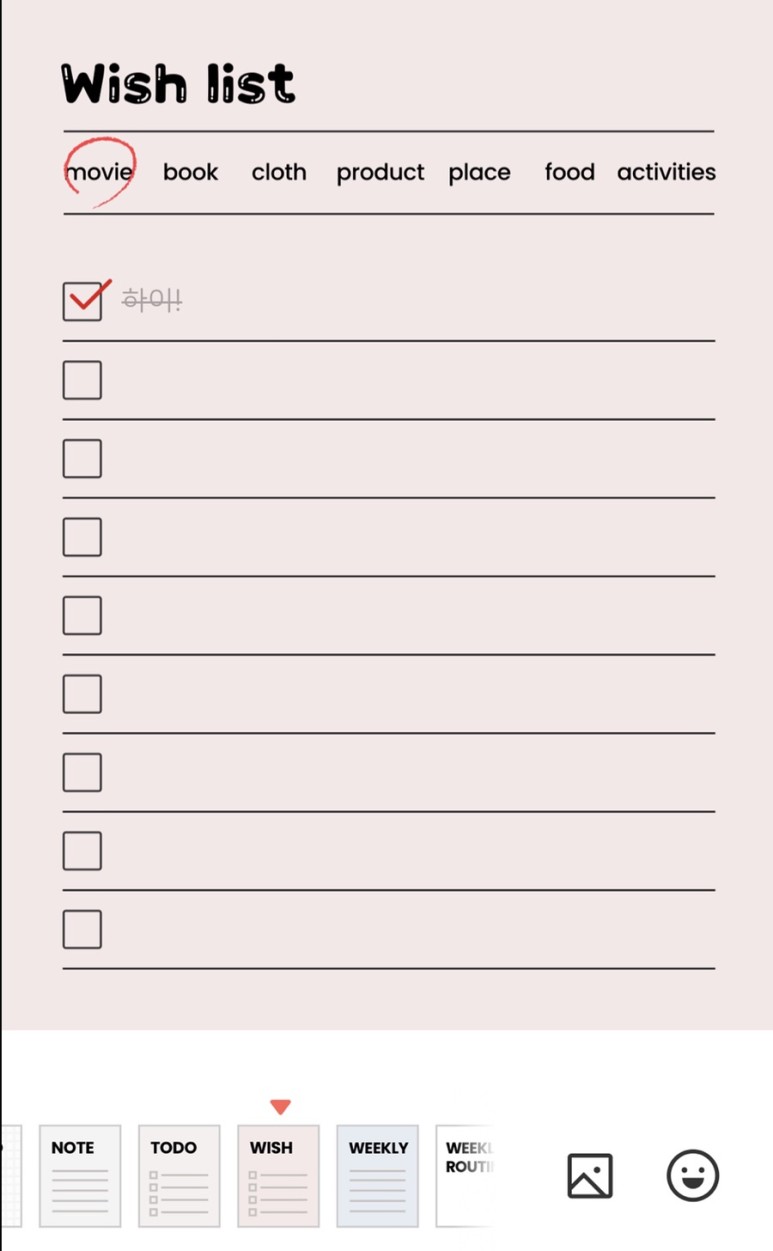 메모, 데일리, 위클리, 지출기록, 위시리스트, 투두리스트, 식단플랜 가능