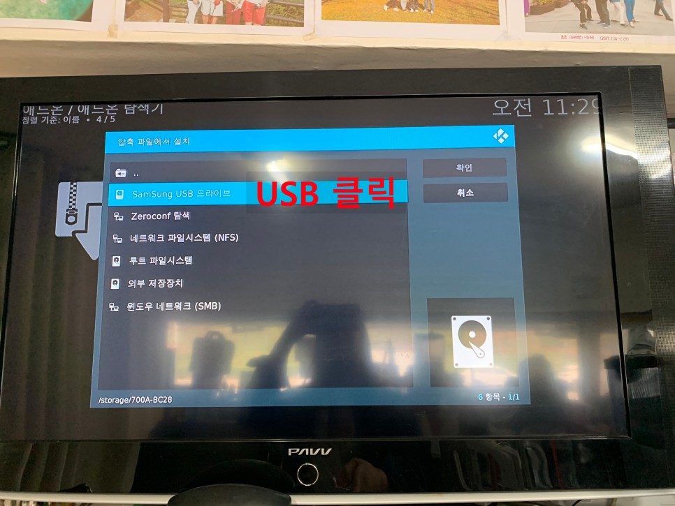 그리고 다시 뒤로 물러서서 아도온을 눌러요 그리고 압축파일의 인스톨 클릭! 그리고 처음에 골라주신 U SB의 이름을 찾아서 클릭을 합니다 저는 삼성 USB 드라이브라고 나와요이걸 클릭해주세요!