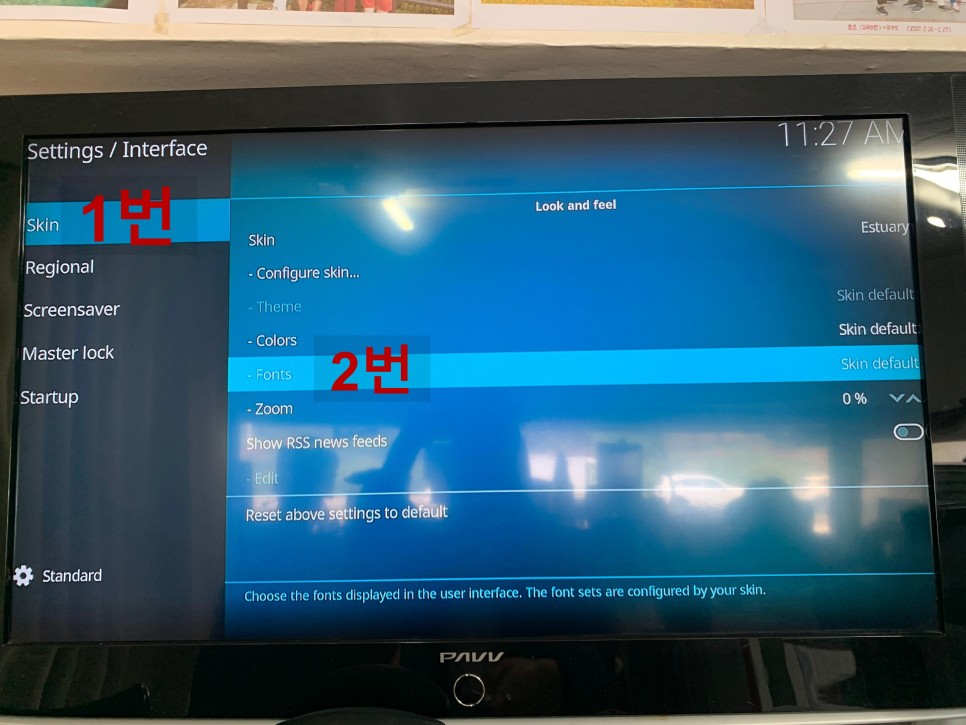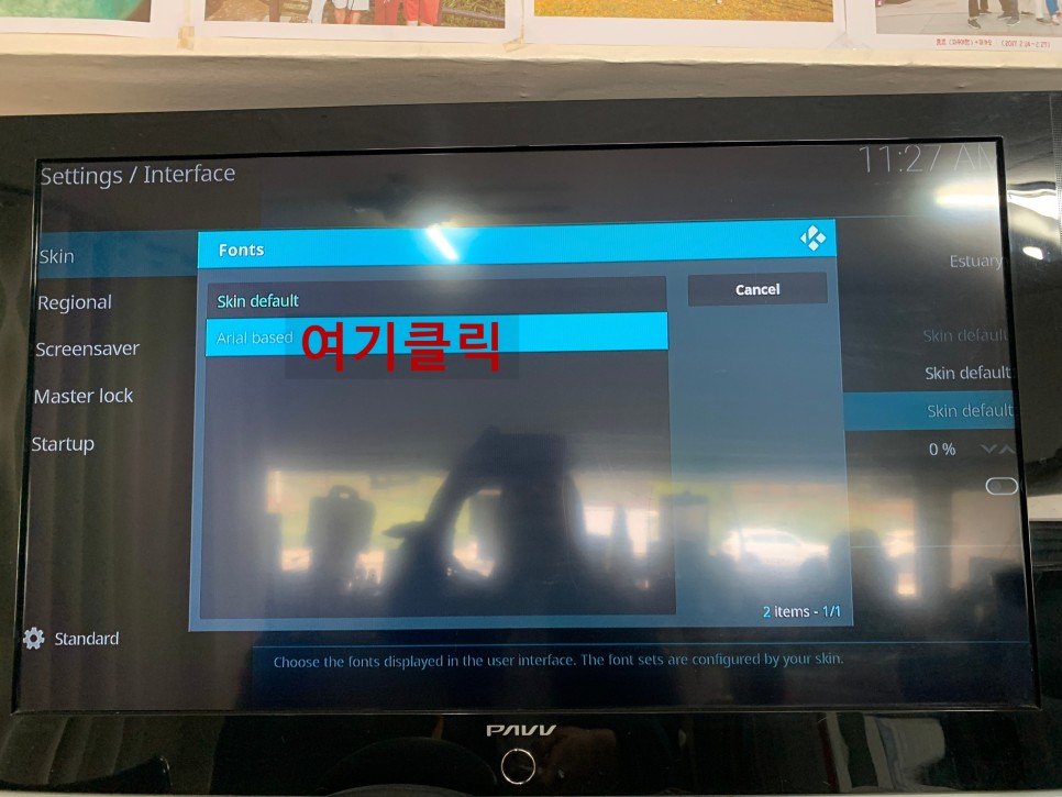 인터페이스 클릭! 왼쪽에 skin을 누른 다음 fon ts를 넣습니다 그다음에 arial based 클릭! 한글로 바꾸었을 때 글자가 깨지지 않고 정확하게 나와요