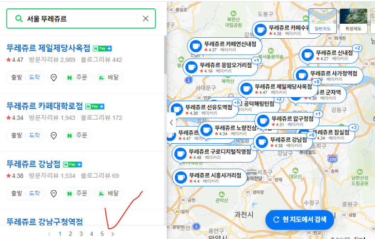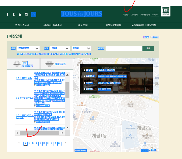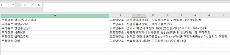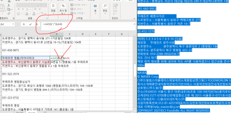 보통 프랜차이즈 같은 경우에는 매장 안내 같은 데서 매장이 나와요 네이버 지도를 이용해서 검색하고자 하는 내용을 입력하면 몇 페이지인지는 모르지만 주소는 표시됩니다. 이걸 활용합시다. 칩은 일일이 블럭 설정하여 복사, 붙여넣기가 싫으면 그냥 Ctrl+A,C를 활용하여 전체 복사본을 붙여넣습니다. 네이버 지도의 경우 주소를 하나하나 찾아야 하기 때문에 가능하면 그 회사의 페이지를 잘 찾는 것이 유익합니다.