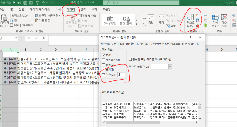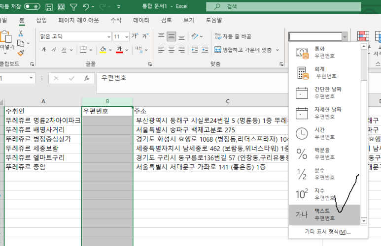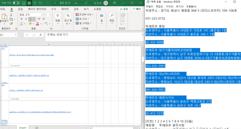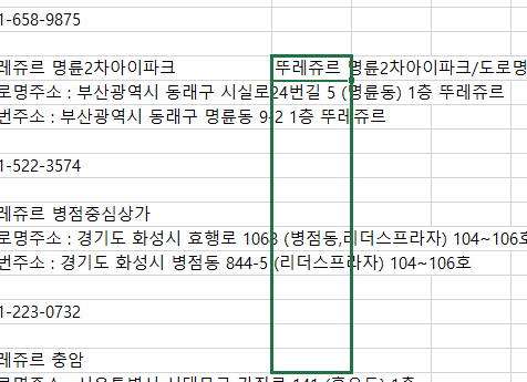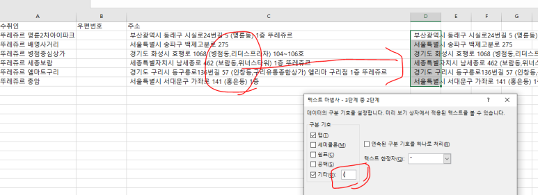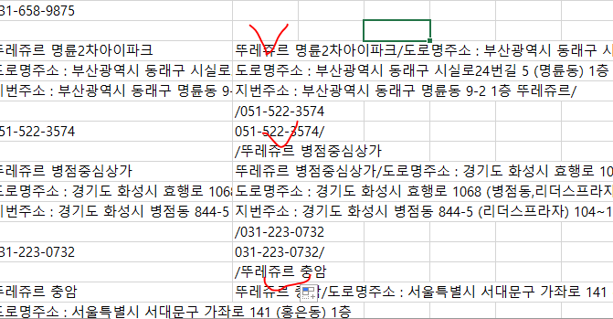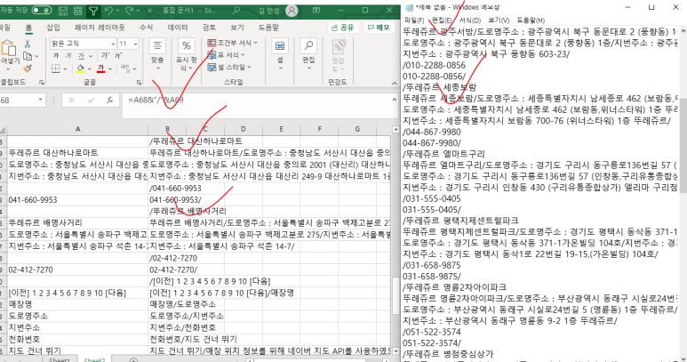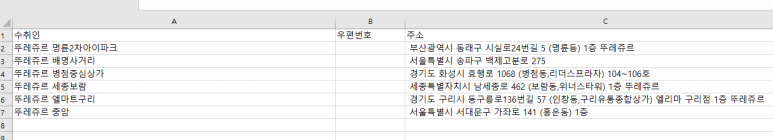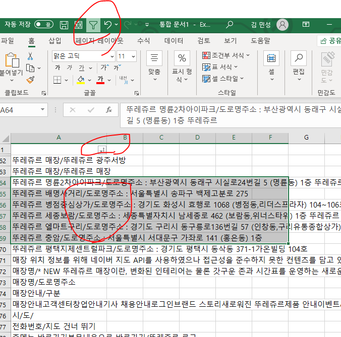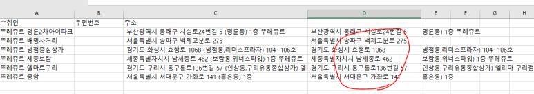 저렇게 &을 중간에 넣으면 나중에 필터를 씌워서 데이터 나누기를 할 때 훨씬 편해집니다 이렇게 수식을 넣고 수백 줄로 끌고 가면 위에 오른쪽처럼 선이 꽉 차 보이는데 거기에 필터를 걸면 되는 그런 방법입니다. 여기서 저렇게 수식을 넣고 바로 필터를 걸치는게 아니라 그 줄만 다시 따로 복사해서 메모장에 넣고 엑셀 새창에서 활용하면 수식이 틀리지 않아요!! 메모장에 붙여놓은 걸 새 엑셀 시트에 붙여놓고 필터를 끼면!!! 딱 뚜레쥬르 00지점 도로명 주소가 나옵니다. 이렇게 하면 수십~수백 개의 자료들도 딱 정렬이 됩니다. 이를 텍스트쉐어링으로 한번 더 구별해 줍니다!! 네, & 수식간 '을 넣은 것은 텍스트 나누기를 염두에 둔 것이었습니다!! 여기서 다시 텍스트를 나눕니다!!! 이렇게 하시면 수십이냐 수백이냐의 주소도 예쁘게 구분하실 수 있습니다!!! 등기를 보내는 방법이든 보통우편으로 보내는 방법이든 우편번호가 필요합니다. 그렇다면 우편번호를 네이버로 하나하나 확인해야하는건가...