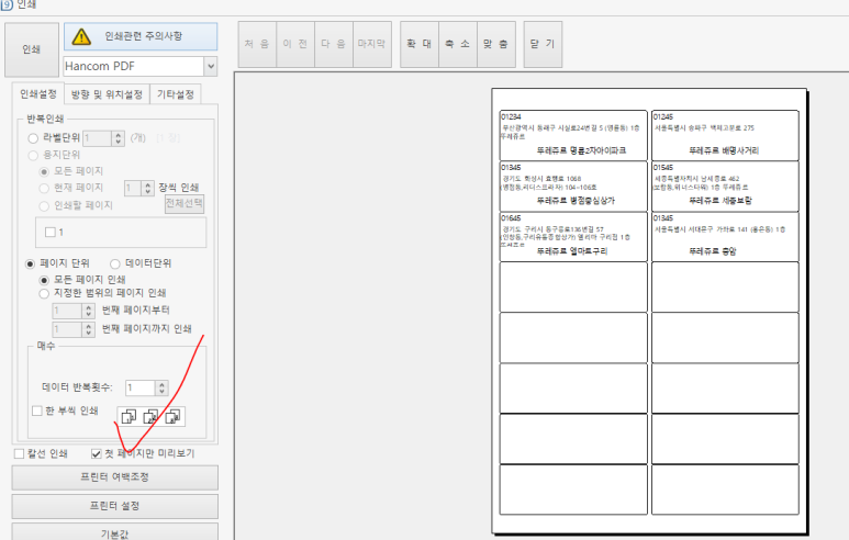 여기서 저같은 경우는 큰 봉투를 업체에 맡기고 (회사 로고와 주소지, 일반 큰 봉투에 회사 주소 스티커도 붙이는 것보다 더 편리합니다) 작업하고, 거기에 봉인용 양면테이프까지 요청해서 주문하겠습니다. (개당 10원? 추가) 여기까지 하시면 봉투에 넣을 인쇄물과 받는사람 주소만 작업하면 끝입니다!!! 주소 라벨 3107을 이용하겠습니다. 1장당 16장, 100장이 2만원 안쪽이고, 1600명에게 보낼 수 있습니다!!! 그런 다음 x를 누르면 적용되고 아래 화면으로 바뀝니다.그럼 오른쪽으로 송신하여, 장소를 지정해 줍니다!! 그 후 칸의 크기, 위치, 글자 등을 조절하기만 하면 됨!!! 인쇄 미리보기를 통해 어떻게 인쇄되는지 확인합니다. 첫 페이지만 표시를 해제하면 다른 페이지들도 확인할 수 있어서 딱 좋아요~~~ 그렇게 출력해서 봉투작업 제대로 하면 끝~~~~ 여기서 또 꿀팁! 저는 주소를 딱붙이는 라벨외곽의 스티커는 다 떼어버리고 다시 떼기쉬워서 반으로 잘라서 붙여야 효율이 올라가요~~ 이렇게 작업을 끝내고 우체국에 가서 일반우편을 보내면 50g에 490원입니다!! 이득 ㅋㅋㅋㅋ(의문 A4 한장에 80g인줄 알았는데 아니었습니다. 저 50g의 내용물은 큰봉지 + A42장 + A3인쇄물입니다.