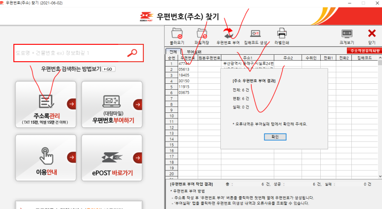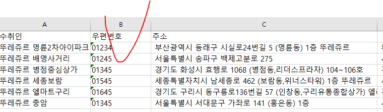 아니요, 그것도 우체국 프로그램이 활용 가능합니다.다만, 우편번호 착오가 있을 수도 있지만, 그것도 엑셀을 조금 더 활용해야 합니다. 주소를 옆줄에 다시 붙여 데이터를 나누면, 그대로 주소와 상세 주소로 나뉘는데, 우리는 보통 주소로 우편번호를 찾습니다!!!! https://www.epost.go.kr/p ost / newzipcode / newZipSearchOn . zip 위 링크에 접속하여 우체국 프로그램을 설치하고 변환한 그대로 주소를 붙여넣으면 아래와 같이 많은 양의 우편번호가 등록됩니다. 만약 실패했을 경우! 네이버 우편번호 검색에서 몇 개를 찾아서 그 프로그램 그 자리에 붙여주세요.그리고 그 우편번호를 메모장에 복사해서 내 엑셀에 다시 넣으면 딱! 끝!! 야근 B2222~~~~