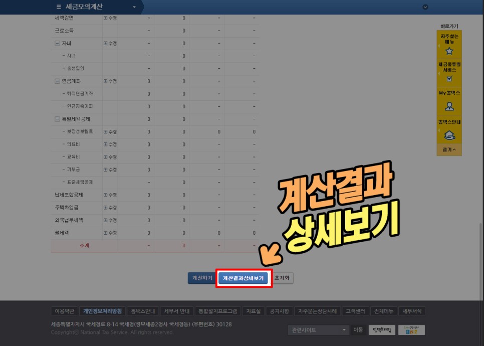 세액감면 세액공제에 해당하는 것 사이사이에 표시되는 "수정"을 클릭하여 입력해 주십시오. 그리고 맨 하단의 '계산결과 자세히보기'를 클릭하면 총 급여액에 맞게 자동 계산되어 올해 환급되거나 불행히도 추가 납부해야 할 금액을 대략 확인할 수 있습니다.