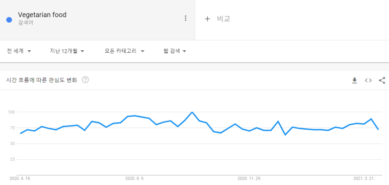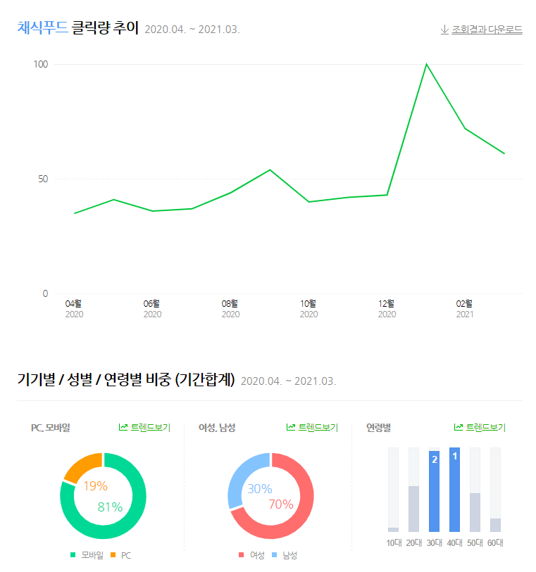 예를 들어 '채식주의 푸드'라는 키워드로 검색했을 때 클릭량은 다소 껑충 뛰는 경향이 있지만 우상적인 흐름을 보이며 30~40대 여성들이 주로 모바일로 검색하는 것을 볼 수 있습니다. 그러면 그들을 대상으로 좁혀서 관련 커뮤니티, SNS 글, 지인 인터뷰 등 추가 조사를 해서 구체화할 수 있는 내용들을 확인할 수 있겠죠?