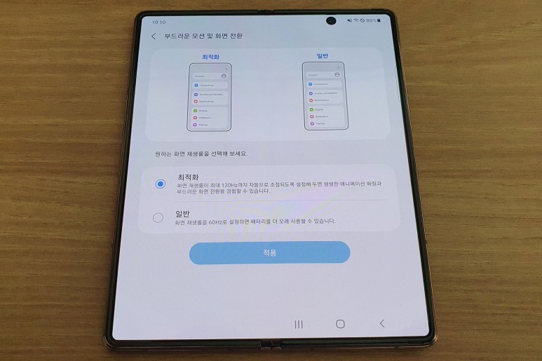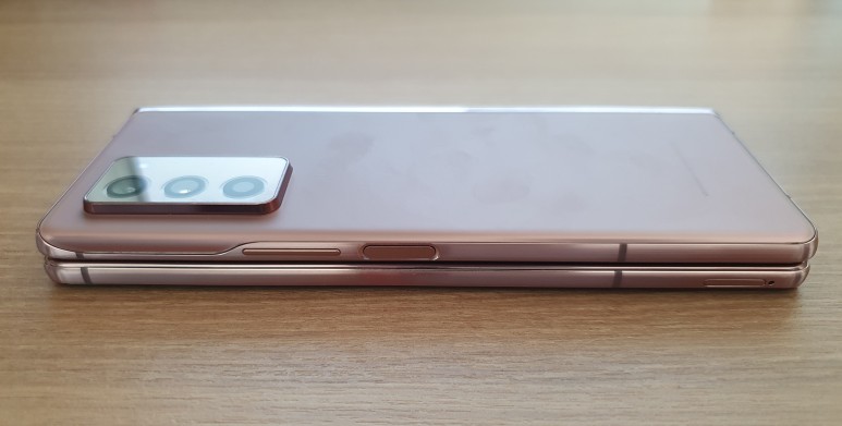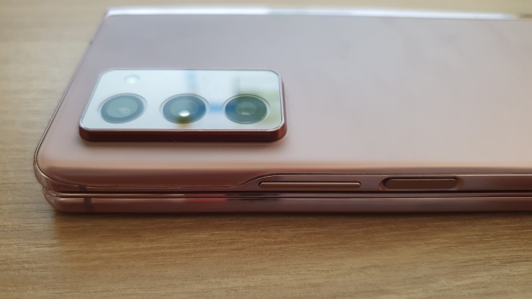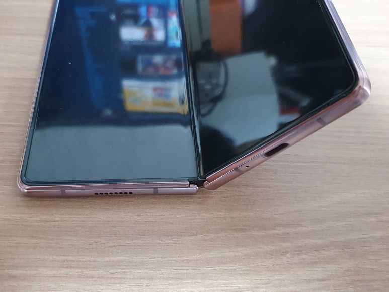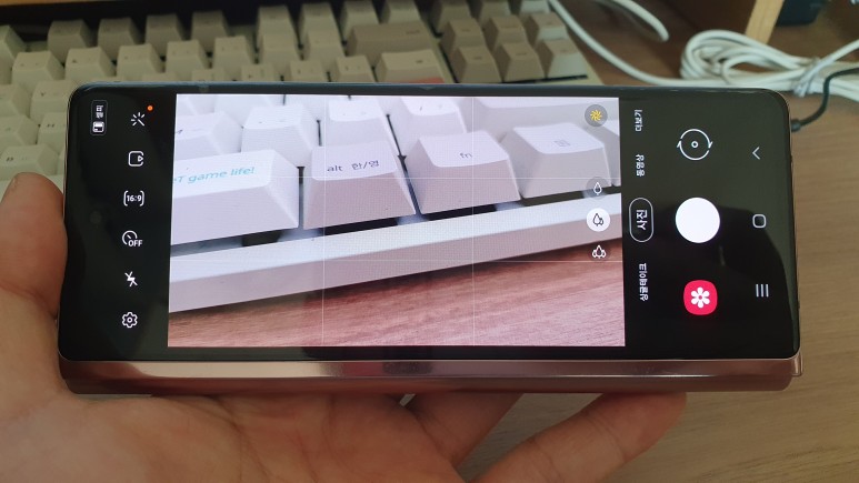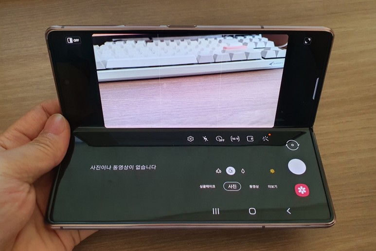 디스플레이 주사율은 120 의 가변 주사율을 설정할 수 있다.화면에 따라 주사율을 조정하는 방식인데 이를 통해 부드러운 화면을 경험하면서도 배터리 효율은 높인다. 다시 돌아가서 상하좌우를 비롯해 힌지 부분까지 전체적으로 살펴보자.힌지 부분은 눈으로 보기에는 약간 들뜬 느낌이다. 그러나 실제로 손에 대고 보면 높낮이나 균형이 맞지 않는다는 느낌은 조금도 들지 않는다. 힌지 쪽에 버튼이 배치되지 않아 자연스럽게 오른쪽에 버튼이 배치됐고 노트10 시리즈에서 개편된 버튼 배치와 마찬가지로 이번에도 볼륨 버튼과 전원 빅스비 버튼으로 나뉘었다. 갤럭시폴드 1세대와 달리 갤럭시Z폴드2는 프리스톱 힌지 기능을 갖고 있다.원하는 각도에서 멈춰 서서 제대로 조정할 수 있는 부분이다. 제1세대는 이 기능이 탑재되어 있지 않고, 흔들거리는 느낌이 강했다고 하면 제2세대에서는 이 부분이 개선되었다.프리스톱 힌지는 카메라 사용성에도 많은 변화를 줬다. 후면의 카메라는 기본 광각 망원 모두 1200만 화소를 가지고 있다.갤럭시S 시리즈와 같은 플래그십 모델에 비해 화소는 다소 떨어진다. 하지만 쓰기에 크게 불편하지는 않을 것이다. 스마트폰을 접은 상태에서는 우리가 흔히 알고 있는 바 형태의 스마트폰 카메라 사용성을 갖고 있다. 메인 디스플레이를 사용할 경우 사양하는 방식으로 사용할 수 있지만, 먼저 큰 화면으로 볼 수 있기 때문에 사진과 결과물을 보다 깔끔하게 확인할 수 있다는 장점이 있다. 또 프리스톱 힌지 기능을 이용해 화면을 둘로 나눠 조작부를 화면 하단에 배치할 수도 있지만 좀 더 세밀한 조작을 원하는 사람에게는 도움이 될 수도 있다.