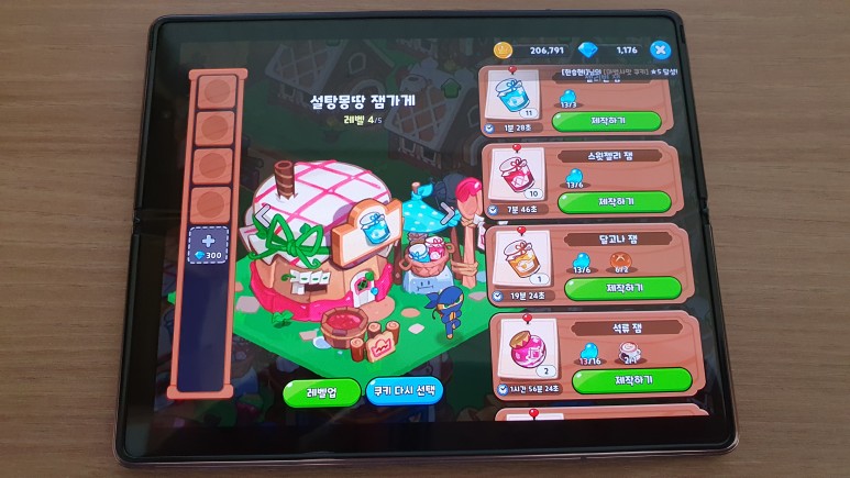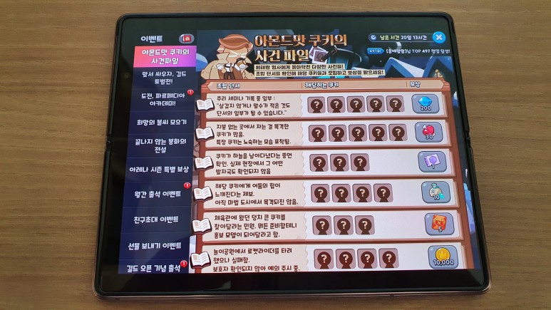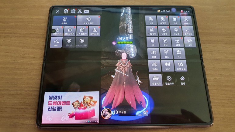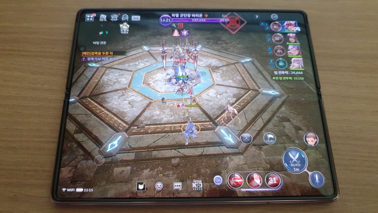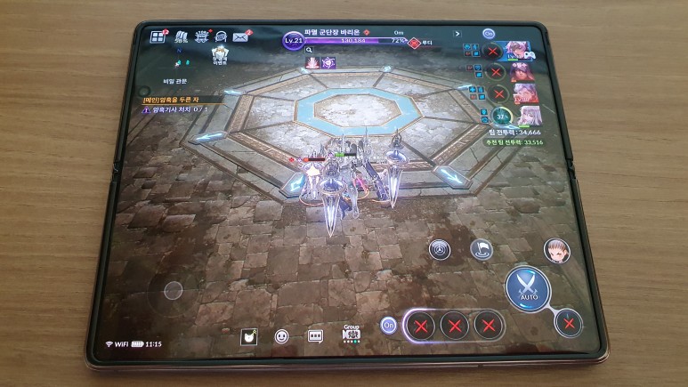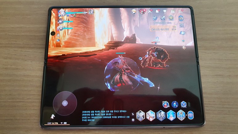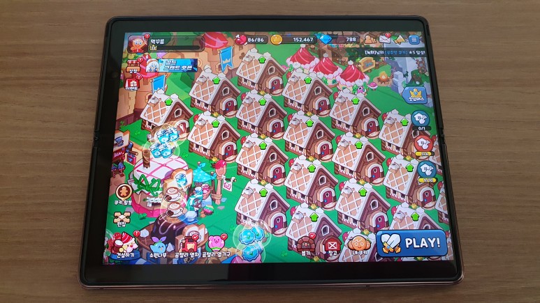 그 외에도 메인 디스플레이와 커버 디스플레이를 오가며 사용하는 앱을 유지해주는 기능이 따로 제공되는데, 그대로 유지되거나 사용자에게 선택지를 주었다는 점에서 매우 훌륭하다고 생각했다.마지막으로 게임기획자의 블로그답게 게임 관련도 한번 기록해봤다. 쿠키렁킹덤의 게임 화면이다 세븐나이츠2의 게임 화면이다 게임의 UI는 어차피 각 화면 모서리를 기준으로 정렬되기 때문에 해상도와 상관없이 화면이 더 깔끔하게 보이는 정도로 나타나는데 이런 화면을 선호하는 사람에게는 매우 매력적인 기기가 될 것 같았다. 모바일용 게임패드를 쓰면 더 좋을 거야.총평하면, 정말로 매력적인 스마트폰이라는 생각이다.가격이 일반 스마트폰의 두 배 정도인 단점을 제외하면 대부분의 기능과 마감 측면에서 마음에 든다는 생각이 계속 들었다. 내가 원하던 기능(원격지원 해상도)에 대한 아쉬움이 있었기 때문에 구입하지 않기로 했지만 단순히 기기의 스펙과 사용성만을 놓고 보면 정말 매력적이고 사고 싶은 제품임에는 틀림없었다.